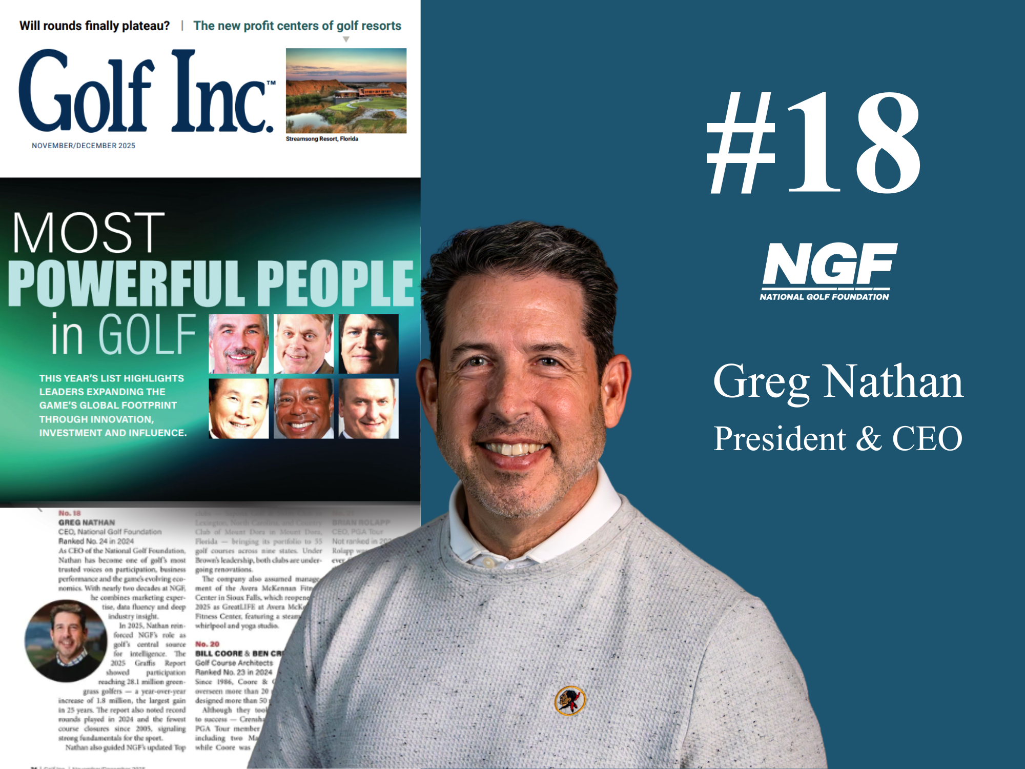 Greg Nathan, President and CEO of the National Golf Foundation, has once again been recognized among the most influential leaders in the golf industry, ranking No. 18 in Golf Inc. magazine’s 2025 “Most Powerful People in Golf” issue.